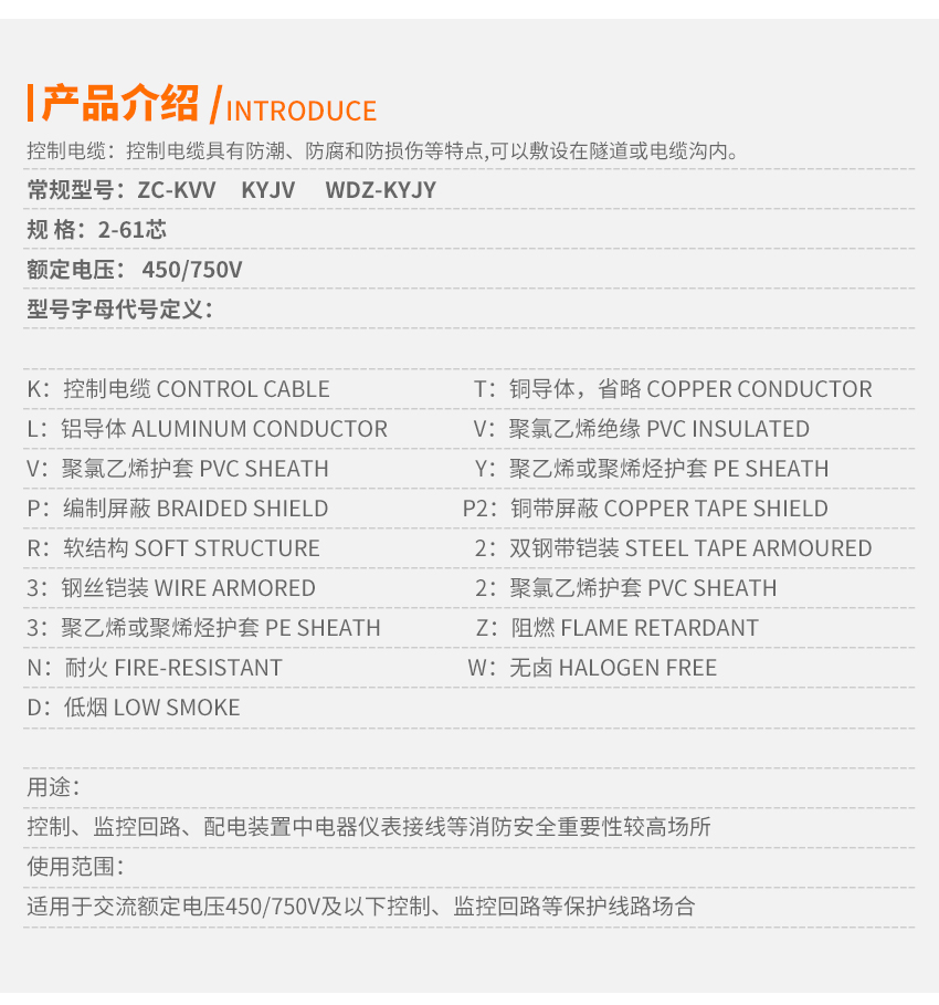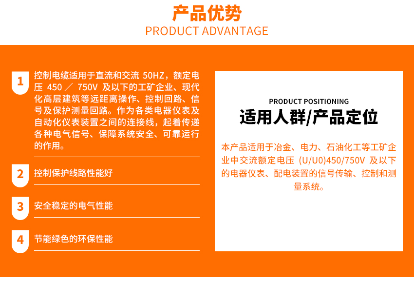 控制電纜是適用于工礦企業(yè)、能源交通部門(mén)、供交流額定電壓450/750V 以下控制、監(jiān)控回路、保護(hù)線路等場(chǎng)合固定敷設(shè)使用的控制電纜。