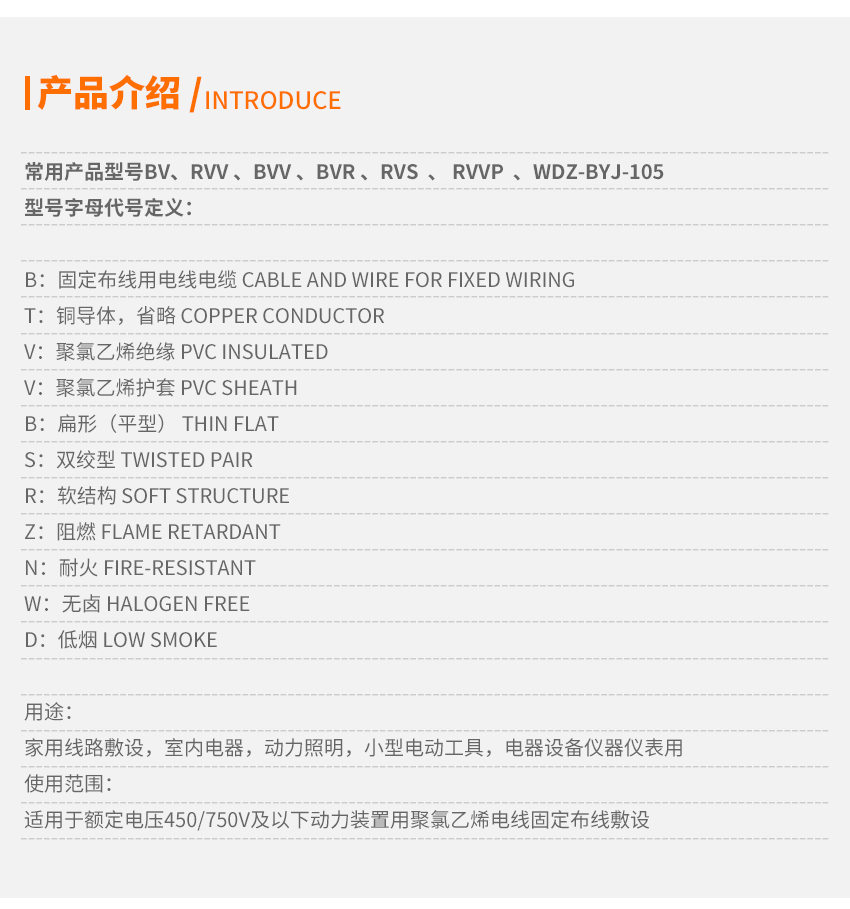 線適用于交流額定電壓U0/U為450/750V及以下動力裝置、日用電器、儀表及電信設(shè)備敷設(shè)用??梢詰?yīng)用于安全環(huán)保、阻燃要求高的場所。如高層建筑、車站、地鐵、機(jī)場、醫(yī)院、大型圖書館。各種工、農(nóng)、工礦企業(yè)所用裝備中的電氣安裝線和控制信號用的電線電纜均屬于此類產(chǎn)品。產(chǎn)品使用范圍最廣、品種多、而且大多要結(jié)合所用裝備的特性和使用環(huán)境條件來確定產(chǎn)品的結(jié)構(gòu)、性能。因此,除大量的通用產(chǎn)品外,還有許多專用和特種產(chǎn)品。